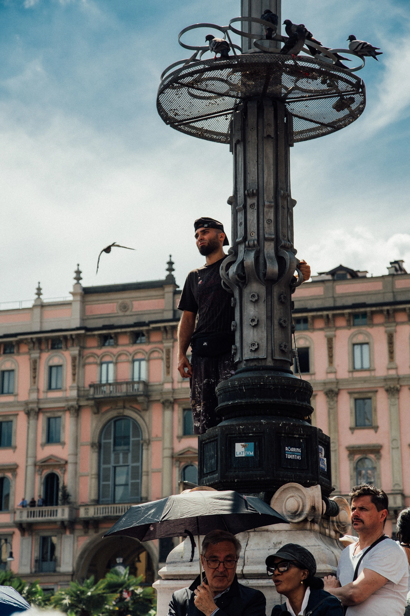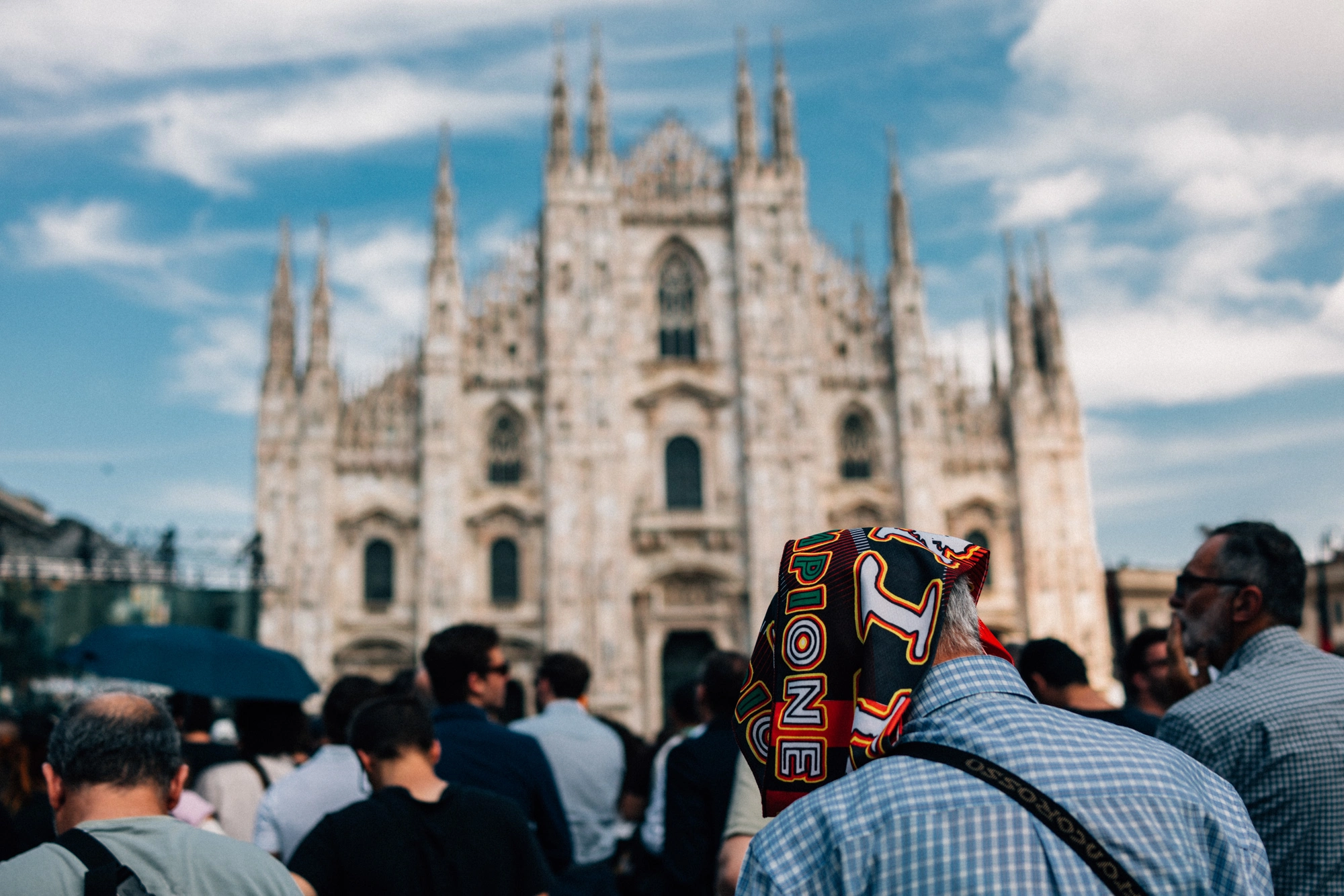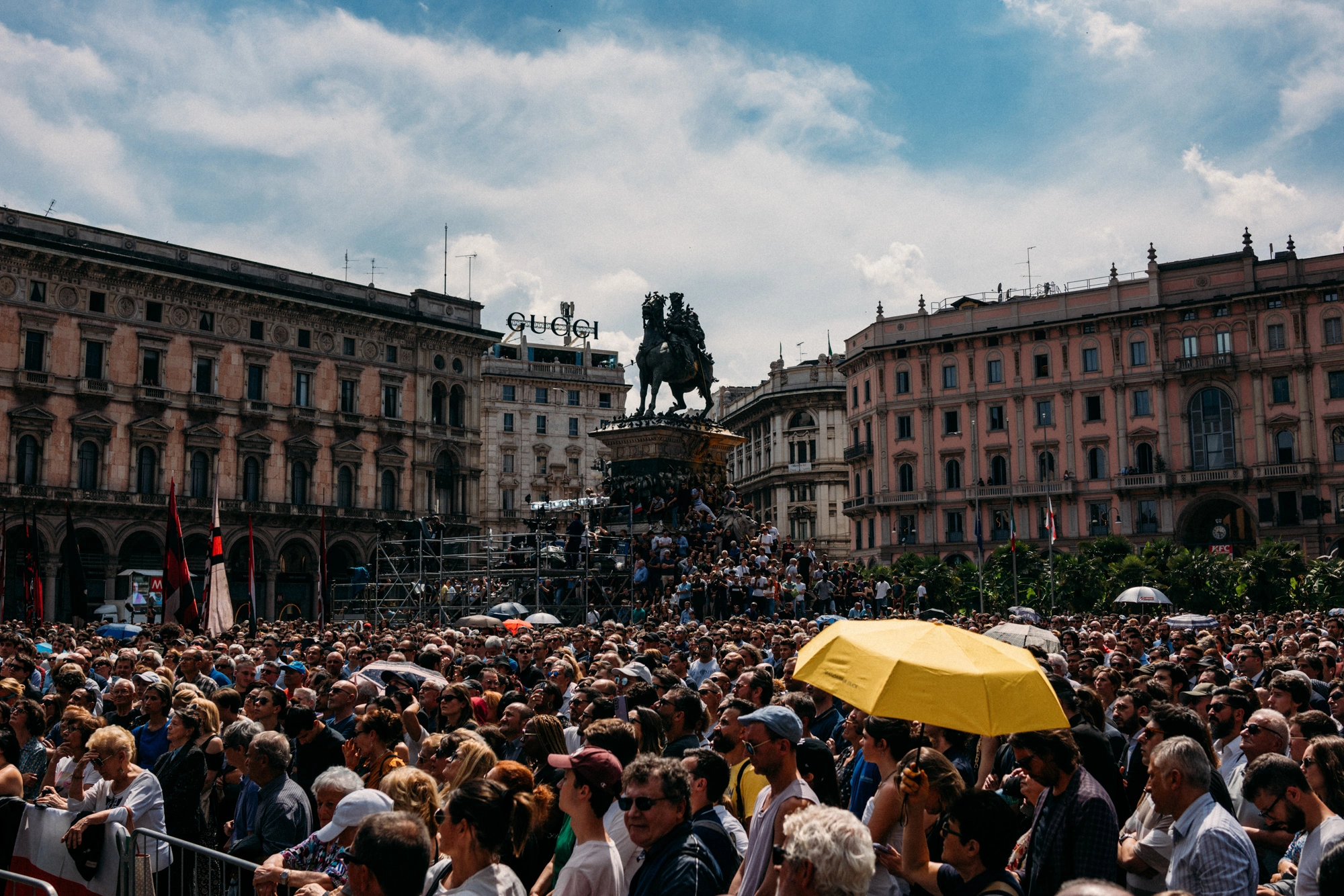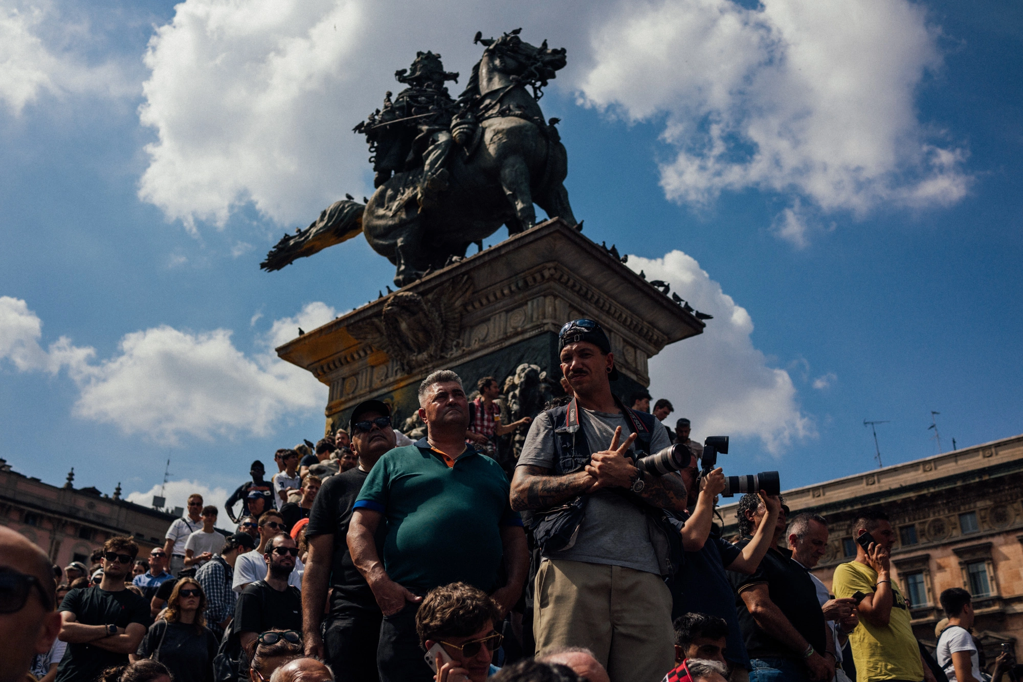 Ho scelto di focalizzarmi sulle persone radunatesi nella Piazza del Duomo di Milano; tra chi, pur di non rinunciare, cercava di resistere alla calura nascondendosi sotto un ombrello, a chi si arrampicava su statue e lampioni per cercare di scorgere qualcosa in più di una moltitudine di nuche. Ho osservato da vicino i volti, le espressioni, le attese e le fronti imperlate di sudore.