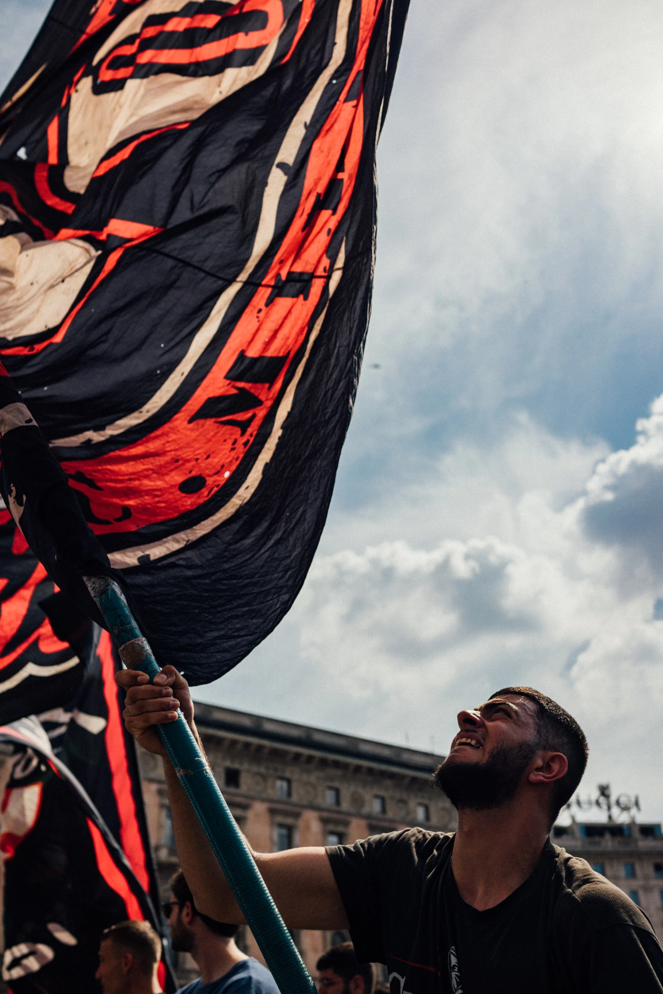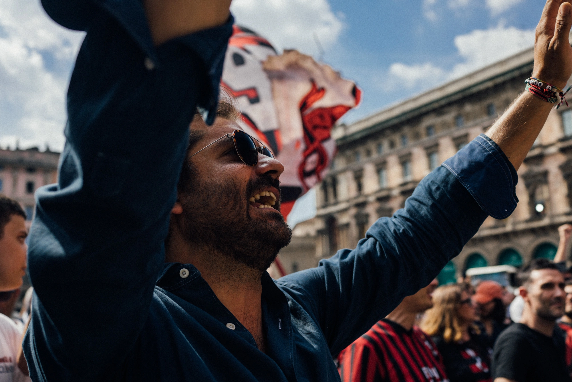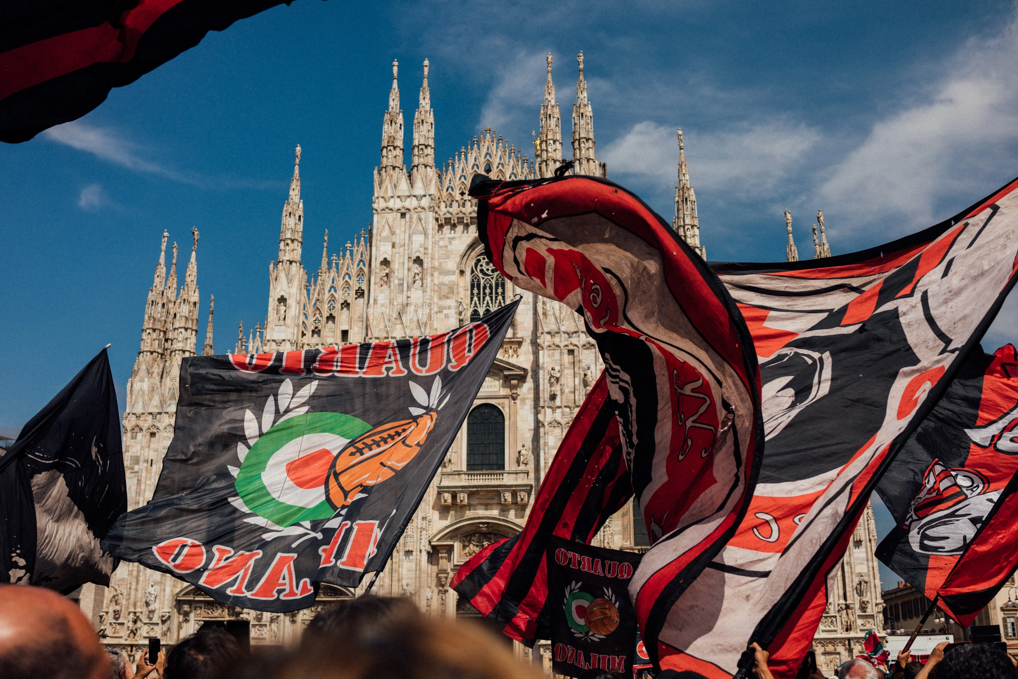 Tra la moltitudine, mi sono posizionato nel cuore del gruppo di ultras del Milan, dove il dolore veniva soffocato da un senso di appartenenza quasi viscerale, dai cori, dalla veemenza dei gesti e dallo svolazzare delle bandiere strappate.