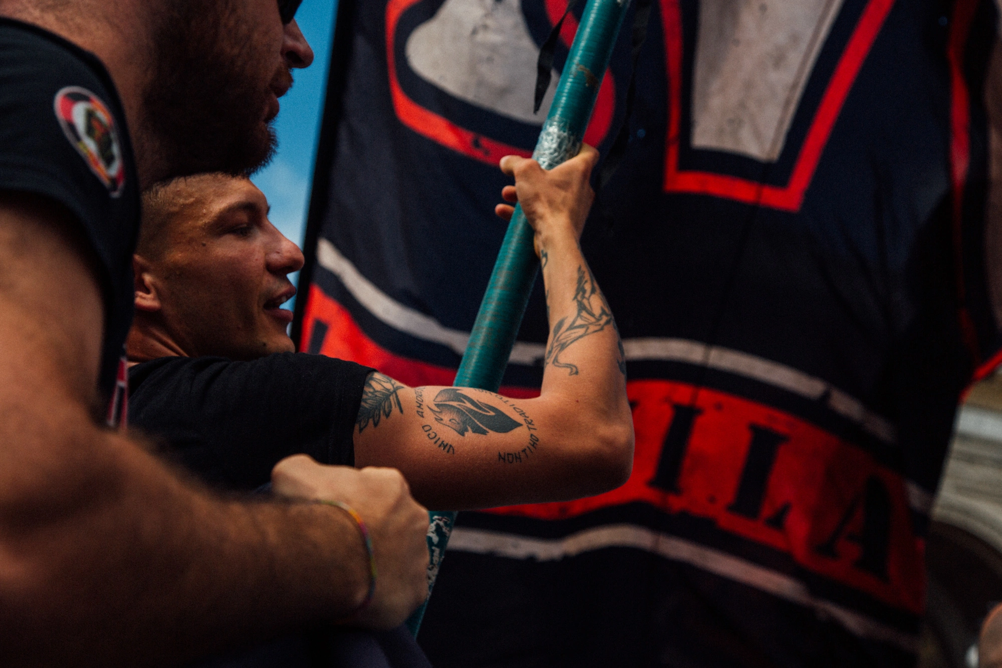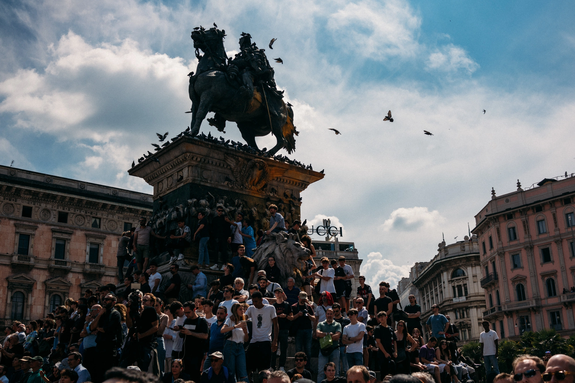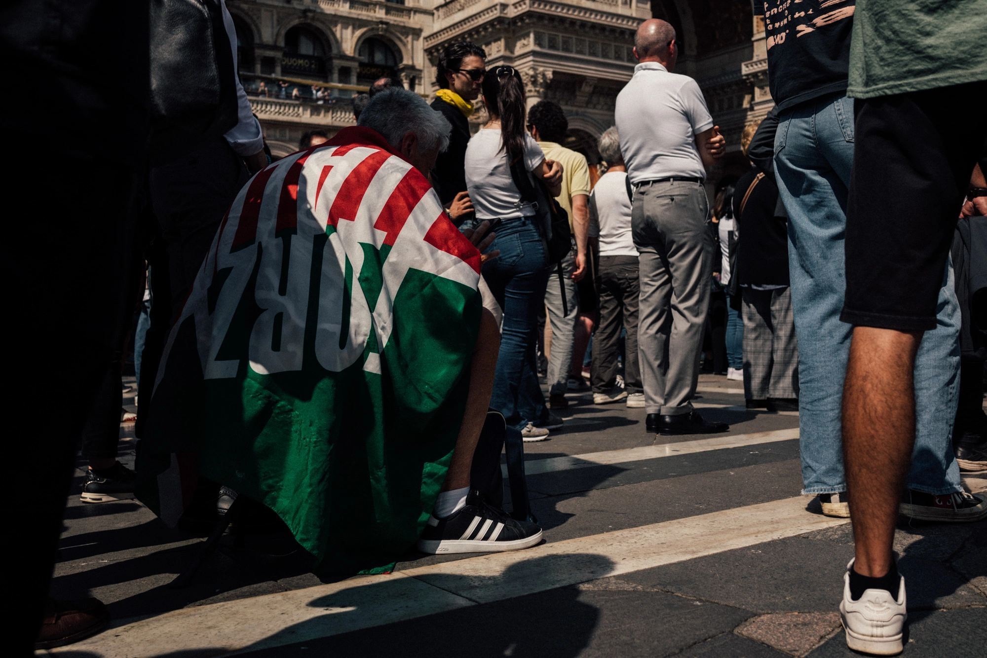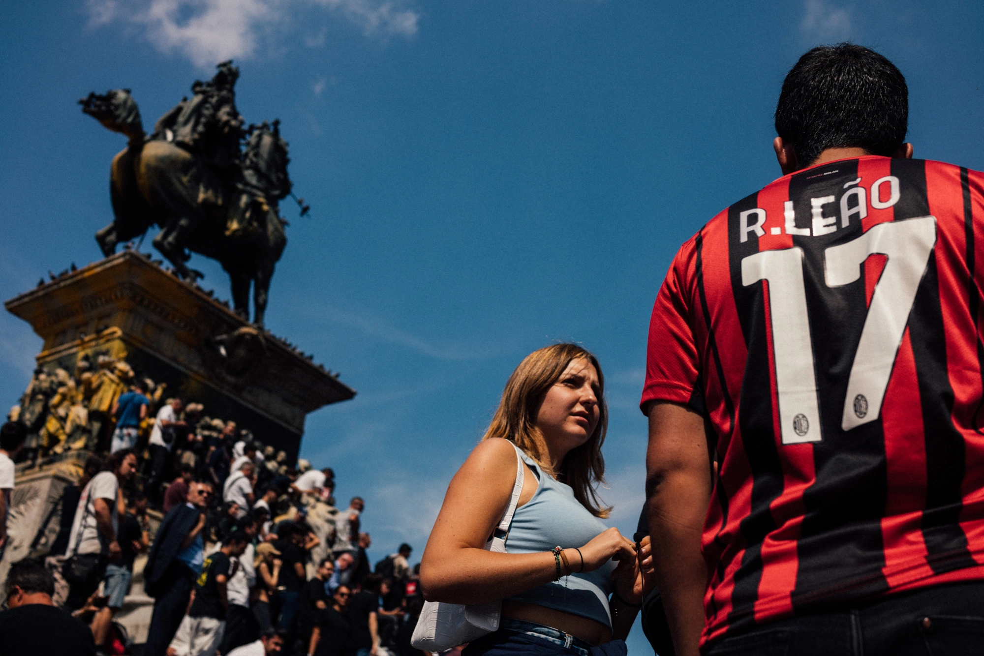 Tra la moltitudine, mi sono posizionato nel cuore del gruppo di ultras del Milan, dove il dolore veniva soffocato da un senso di appartenenza quasi viscerale, dai cori, dalla veemenza dei gesti e dallo svolazzare delle bandiere strappate.